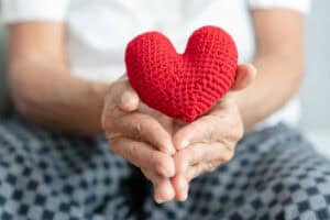 Any questions related to Senior woman holding red yarn heart shape concept of healthcare for elderly heart attack and surgery?